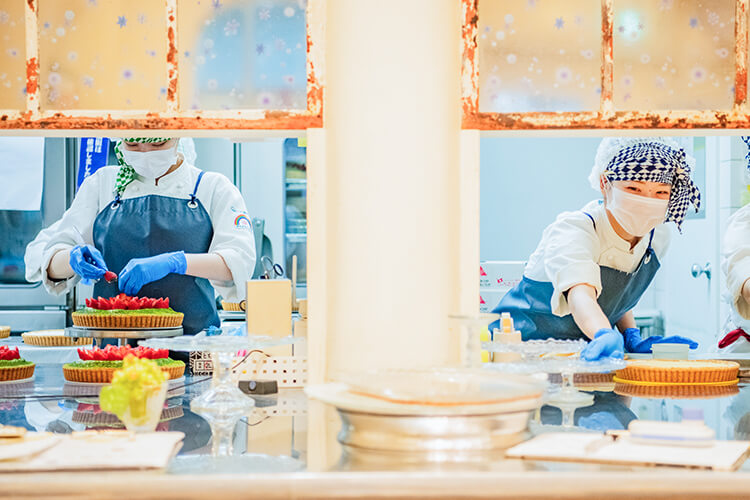 各店舗内に併設されたキッチンで、タルトのデコレーション・カットを行います。